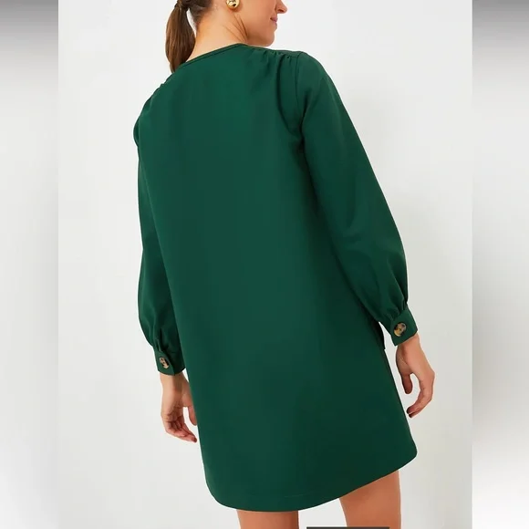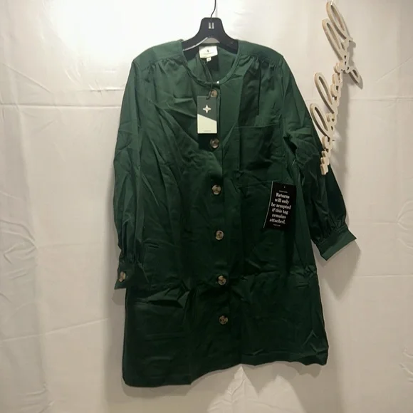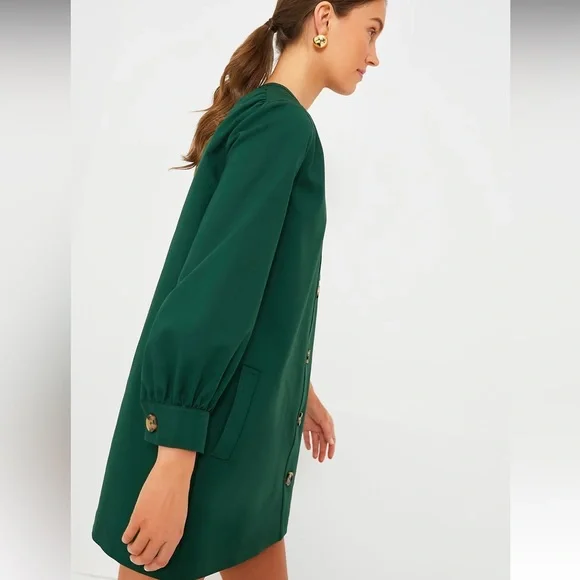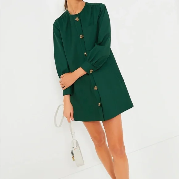 Featuring a full front placket with tortoise shell buttons, long puff sleeves, and a boxy silhouette, the Dark Green Blake Dress is the perfect mod-inspired style. With pockets along the side seams and left chest for extra fun and function, this edgy mini is casual cool while still exuding chic sophistication. Perfect for year round wear, pair this desk to drinks number with heeled sandals for warm days ahead and swap for loafers or boots as the temperature drops.Crew necklineLong puff sleevesFull front placketTortoise shell buttonsFront breast pocketSide pocketsBoxy silhouetteMini lengthMaterial: 65% Cotton, 32% Rayon, 3% SpandexCare: Machine wash cold, hang to dryXxs pit to pit 19”Xs pit to pit 19.5”S pit to pit 20.5”Xl pit to pit 23.5”**Authentic Tuckernuck**