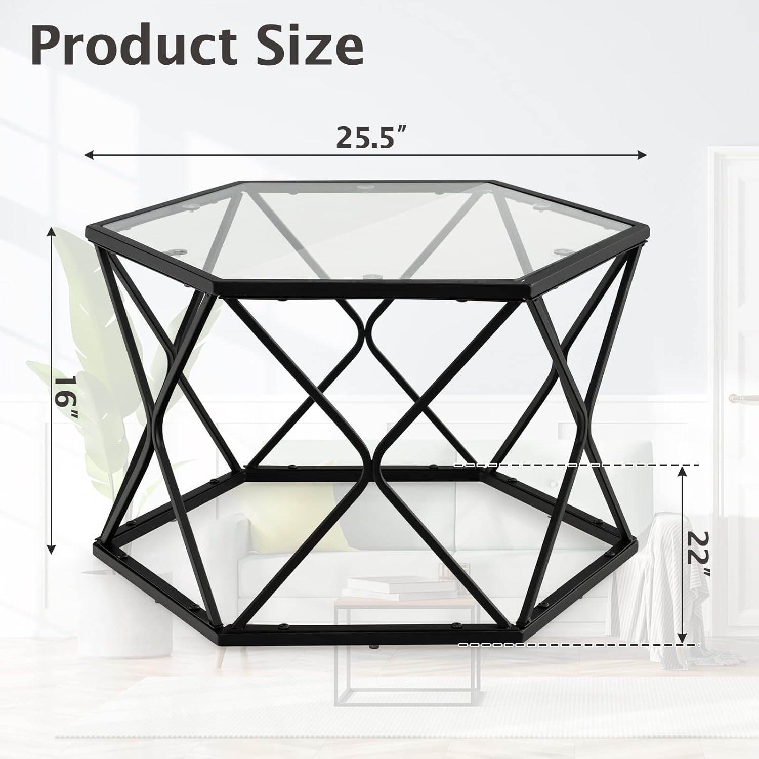 Hexagonal Glass Coffee Table, End Table W/Tempered Glass Top & Sturdy Metal Legs, Modern Center Table, Geometric Small Glass Table For Living Room, Reception Room, Black