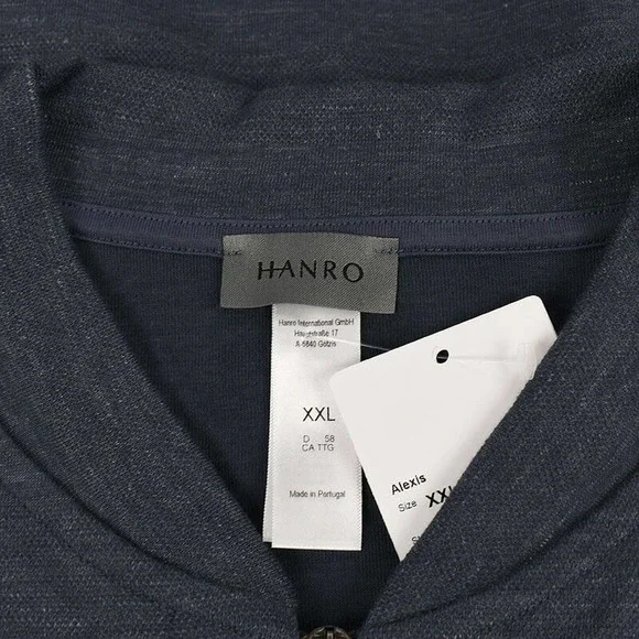 HANRO Men's Lava Rock Gray ALEXIS Full Zip Double Face Cotton Jacket NWTSize: XXLDetails: * Hanro * Men's Jacket * Model: Alexis * Model no: 075170 * Size: XXL * Color: Lava Rock (Gray) * Made of 75% Cotton, 19% Polyester & 6% Polyamide * Double Face Jersey * Made in Portugal * Machine Washable * Regular Fit * Varsity Collar * Full Zipper Closure * Hand Pockets * Banded Cuffs & HemMeasurements: * Chest: 51" * Back: 20-3/8" * Sleeve: 26-3/8" * Length: 28-5/8"Condition: * New w/ Tags - No Defects