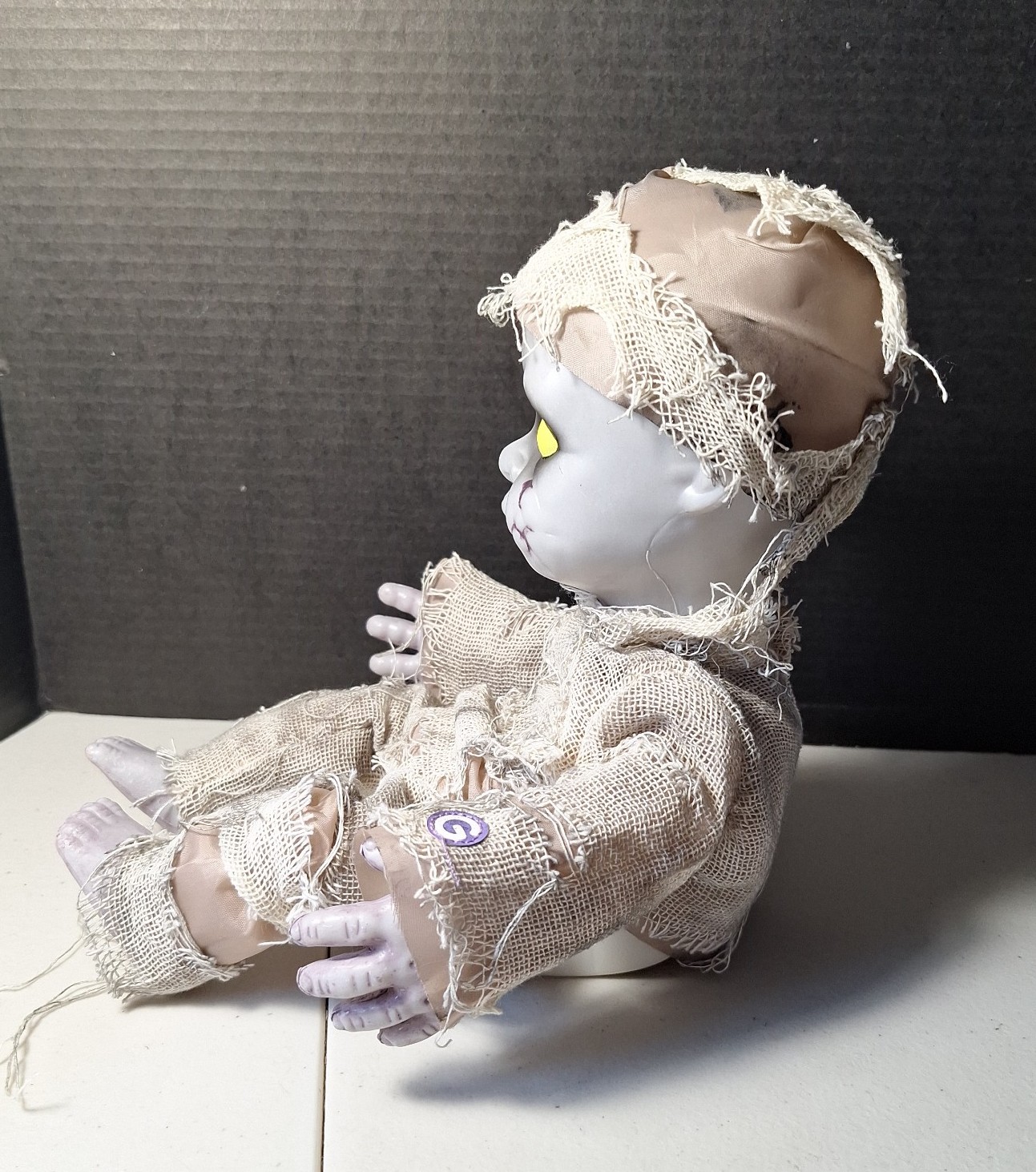 This doll requires 3 - AA batteries to animate and comes with additional parts required for use. Care instructions include cleaning with a damp cloth. Bring some animation to your Halloween celebrations with this unique and scary mummy doll. New in box only open to be tested and works great