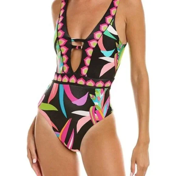 NWT Trina Turk Birds of Paradise Plunge One-Piece Swimsuit Women's Size 14Vibrant hues up the saturation against a chic black background in this eye-catching one-piece swimsuit. With a waist-defining placed print, a plunging V-neckline, and flattering cheeky coverage, this sleek, printed one-piece will become an instant swim staple in your vacation wardrobe.- V-plunge neckline- Open back with single strap- Removable cups- Waist-defining print placement- Secure spaghetti connectors at neckline- Cheeky coverage- One-piece swimsuit- Runs small; see size chart83% Nylon, 17% SpandexLining: 84% Nylon, 16% SpandexAbout Trina Turk:California native Trina Turk (who learned to sew at age 11) designed for contemporary and sportswear lines before debuting her own label in 1995. Her collection is inspired by L.A.'s architecture and multicultural heritage along with the desert's poolside lifestyle, which led to a swimwear line featuring fun prints and flattering shapes.New with tags.Originally $162Women's size 14 (See Trina Turk size chart for details.)FAST shipping! Check out other items in my closet to bundle for a discount.New to ? Sign up with code VTROLLINGSTONE for $10 off your first purchase.