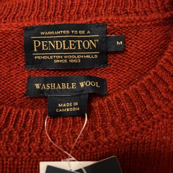 Pendleton Men’s Washable Shetland Collection Sweater in Size medium. Color is Fired Brick Heather. New with tags. A classic pullover sweater knit from warm, pure wool sourced from sheep ranchers in New Zealand. Naturally odor and stain resistant, it’s a cool weather favorite you’ll want in more than color. 100% Shetland woolMachine washChest measurement laying flat 22.25 inches Length 27 inches00009