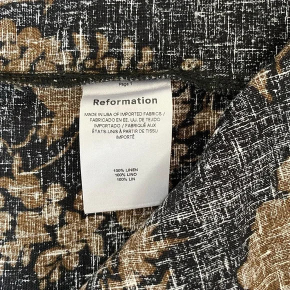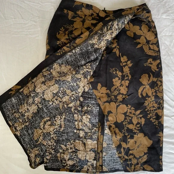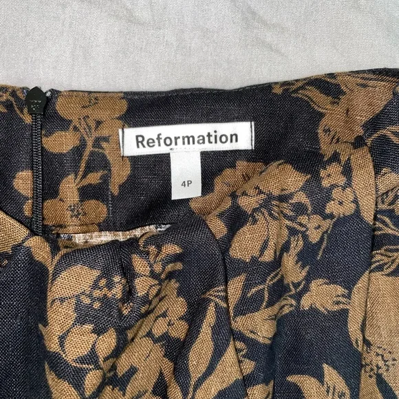 Don't flirt with me. Shop the Petites Hazel Linen Skirt from Reformation,a knee length, linen, column skirt. It features a twist detail and front slit.Brassy, gold flower print detail in black backdropNew without tag and never worn or washed Machine wash cold, lay flat to dry100% Linen24” LongSize 4 petite