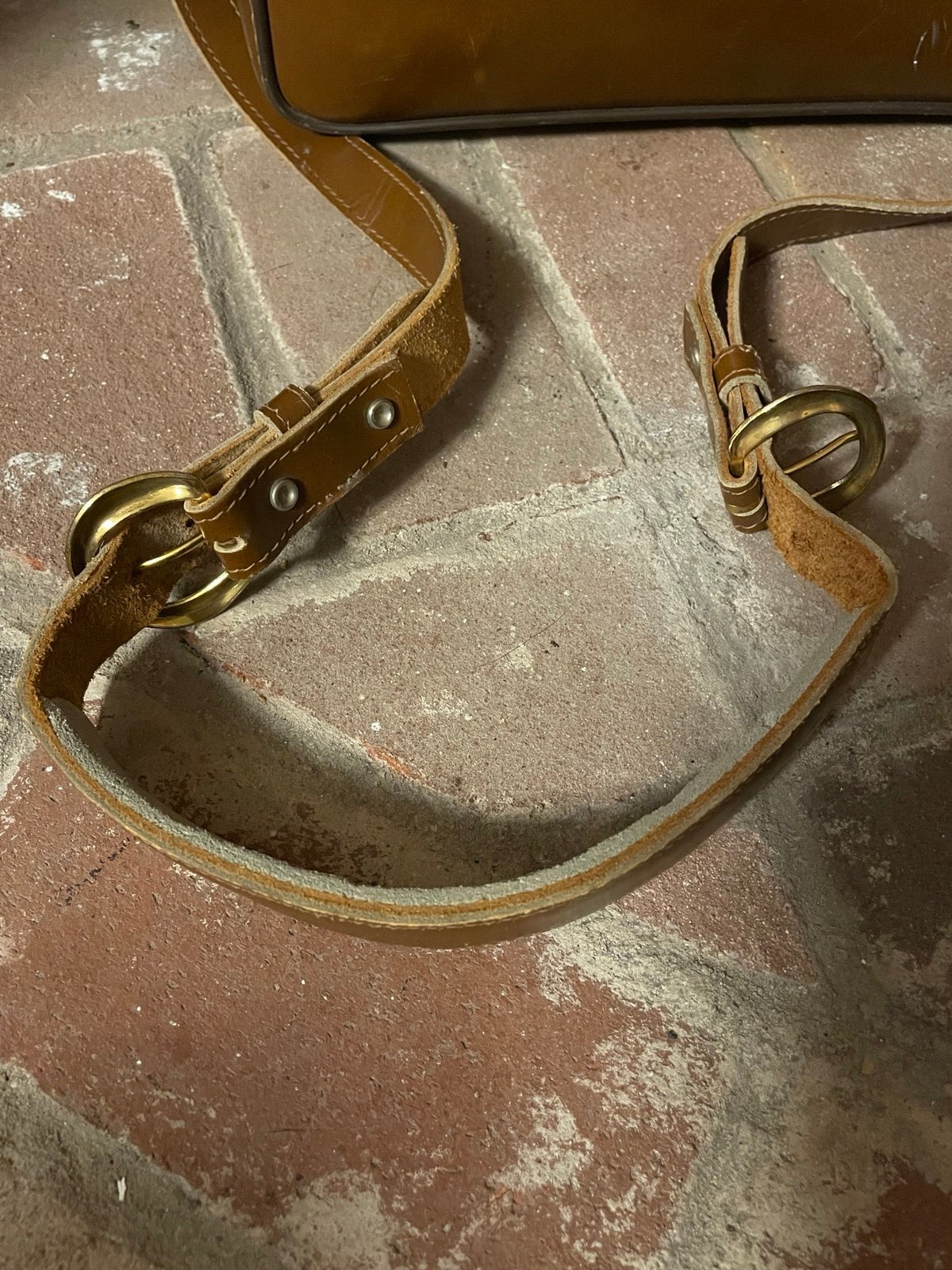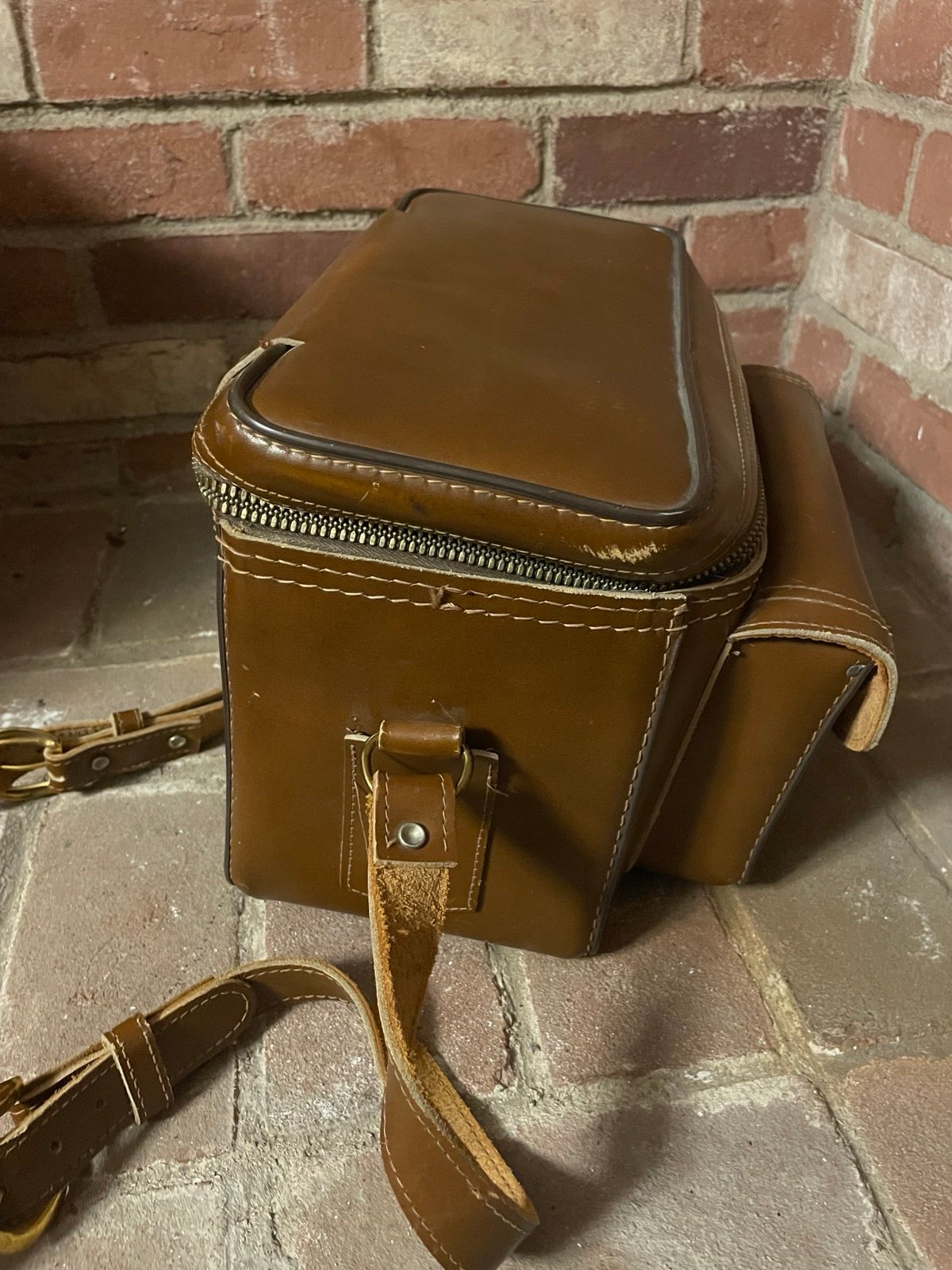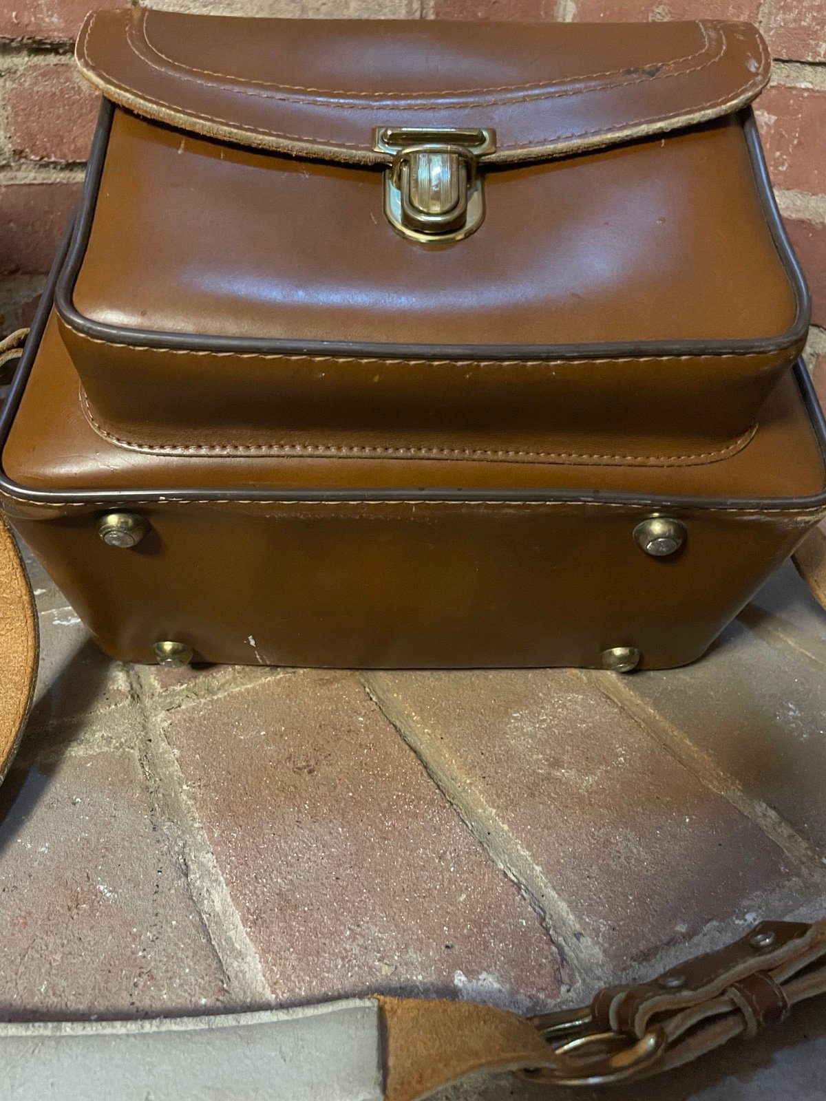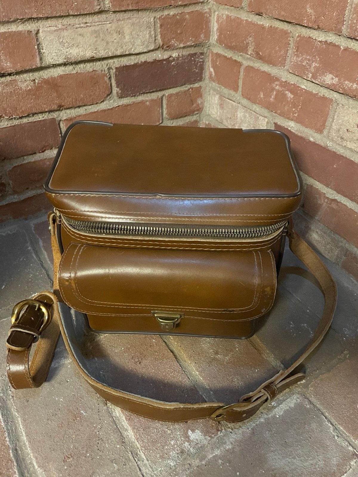 Beautiful vintage camera bag , in good condition , has all four gold feet , orginal thick leather strap , zipper is in very good functional condition , interior is very clean .