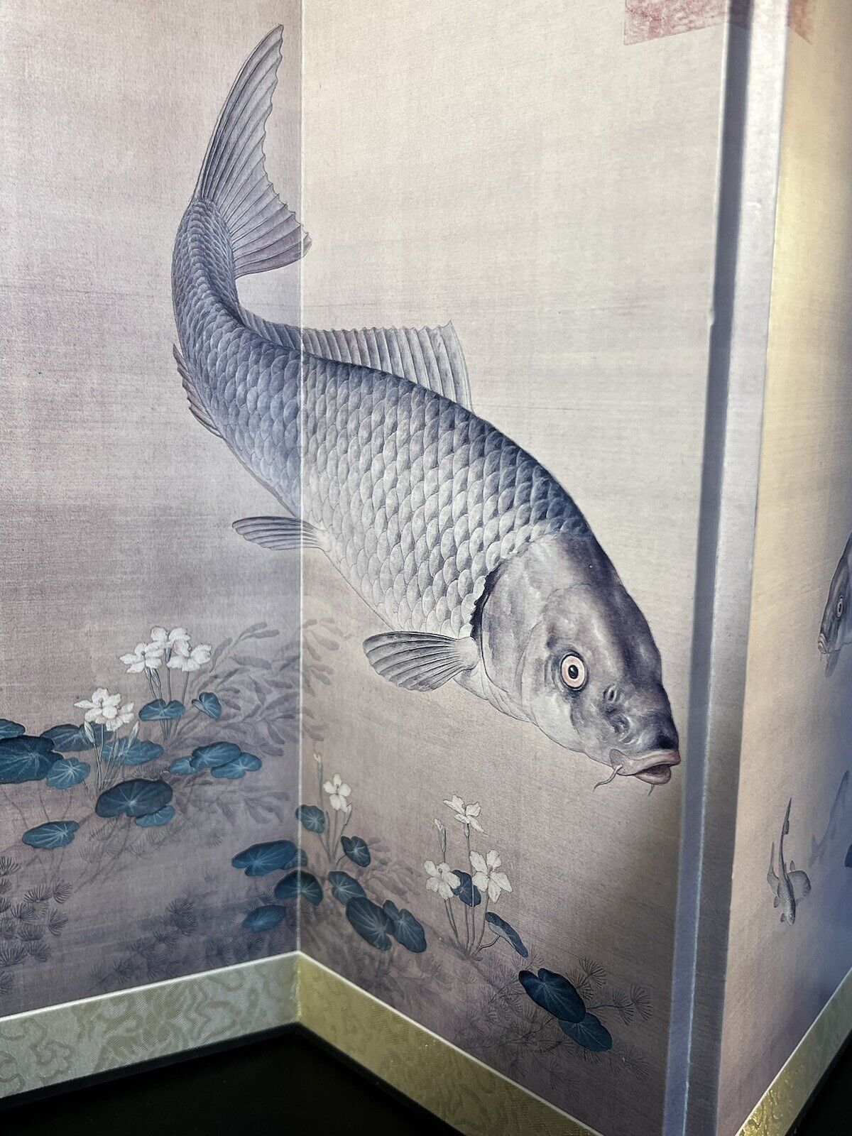 Vintage Japanese BYOBU 4 Panel Screen Carp Koi Fish. Measures 22 inches by 14 inches when unfolded. In excellent pre-owned condition. Please refer to photos for more detail.