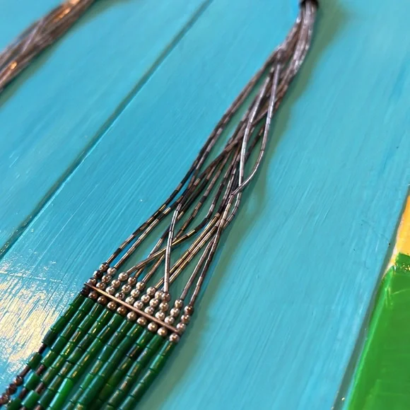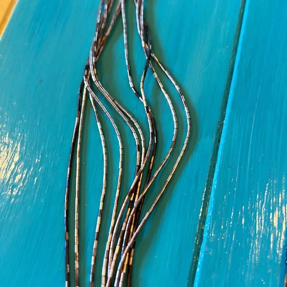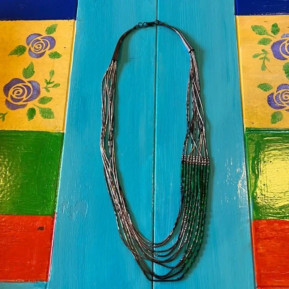 Gorgeous rare vintage Native American artist/tribal marked 10 strand necklace (unknown mark but looks similar to Navajo or Zuni symbols I found on Pinterest-please help me out if you know so I can add it to the listing 🙏🏻). Sold as found tarnished, vintage 30s to 50s. No damage or missing beads. Strings have give, I think for the design so if it gets tangled it doesn’t snap. To be clear it’s artist marked but not .925 or Sterling but you can clearly see it’s Sterling. No damage, a true collectors piece.