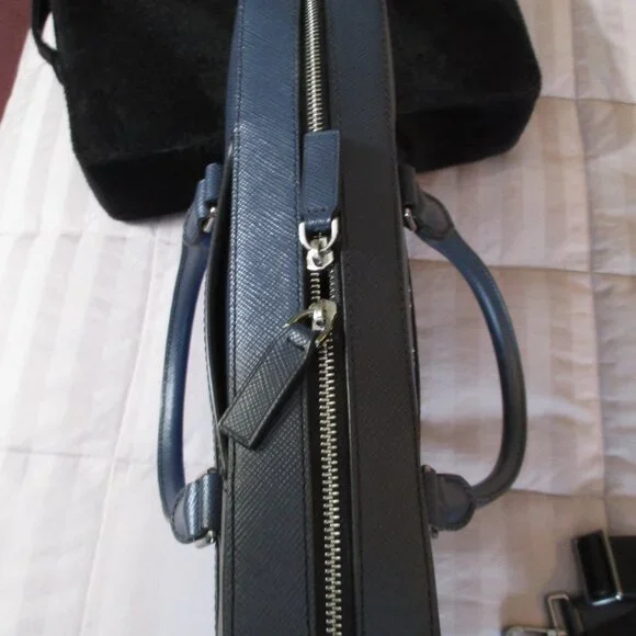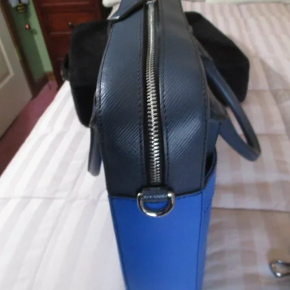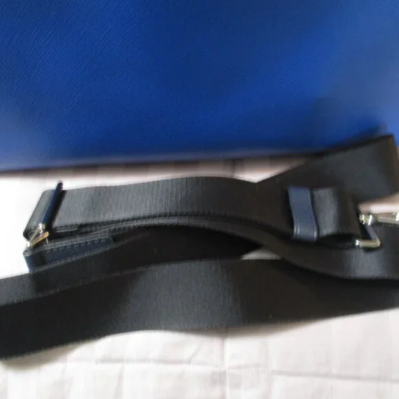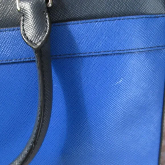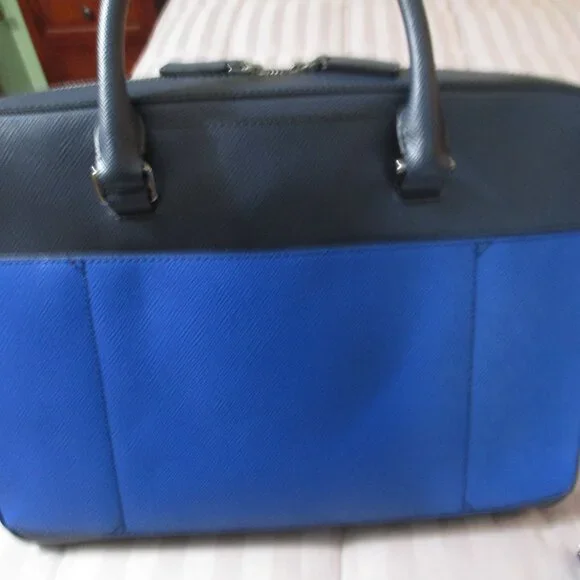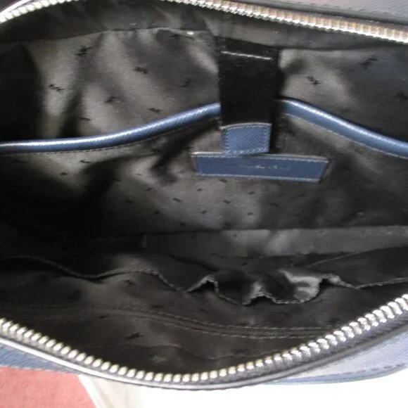 Pre-owned and in like new condition. Made of vinyl and cloth. Features front zip pocket, double zip top closure, back slip pocket, 2 carry handles, detachable adjustable strap, inner velcrow close pocket, inner zip pockets 2 inner slip pockets, 3 pen pockets and 1 back phone slip pocket. Measures approx. 15" x 10 1/4" x 2 1/2". Has one small mark on the front as shown in picture. Used only a couple of times. This bag is authentic Michael Kors with me purchasing it at a genuine MK store myself.
