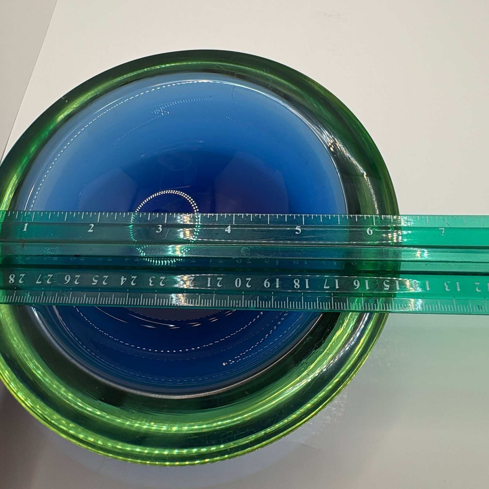 Stunning vintage Sommerso style Murano Glass Bowl, in rich green & cobalt blue. It was made using a technique where multiple layers of glass are submerged within each other, creating a unique color effect.