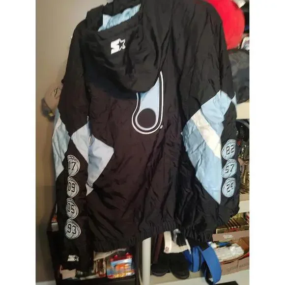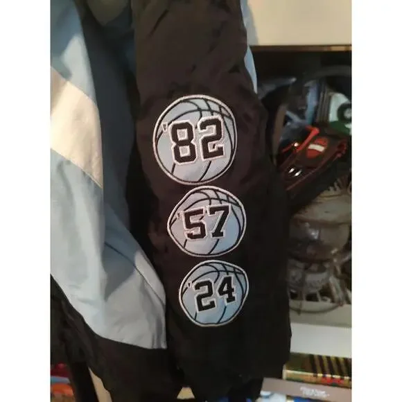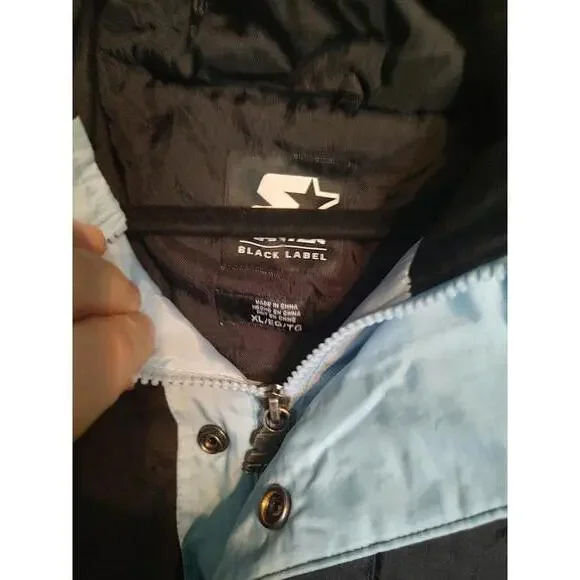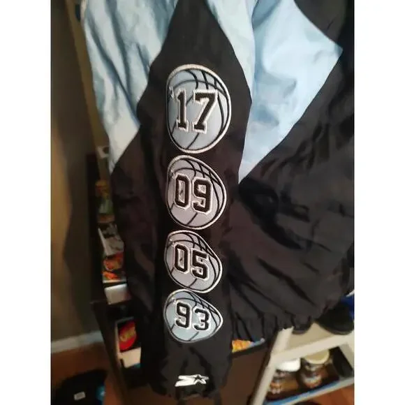 Elevate your style with this Vintage Starter UNC Windbreaker Jacket featuring a sporty design that's perfect for casual outings or game days. Made from lightweight, durable fabric, it offers both comfort and functionality. Key features include:- Unique black and light blue color scheme with iconic UNC logo- Adjustable hood and elastic cuffs for a snug fit- Multiple embroidered basketball-inspired graphics on the sleeves- Designed for ultimate breathability and movement- Size XL for a relaxed and comfortable fit. Perfect for fans and collectors alike, this jacket combines style and functionality in a timeless design.