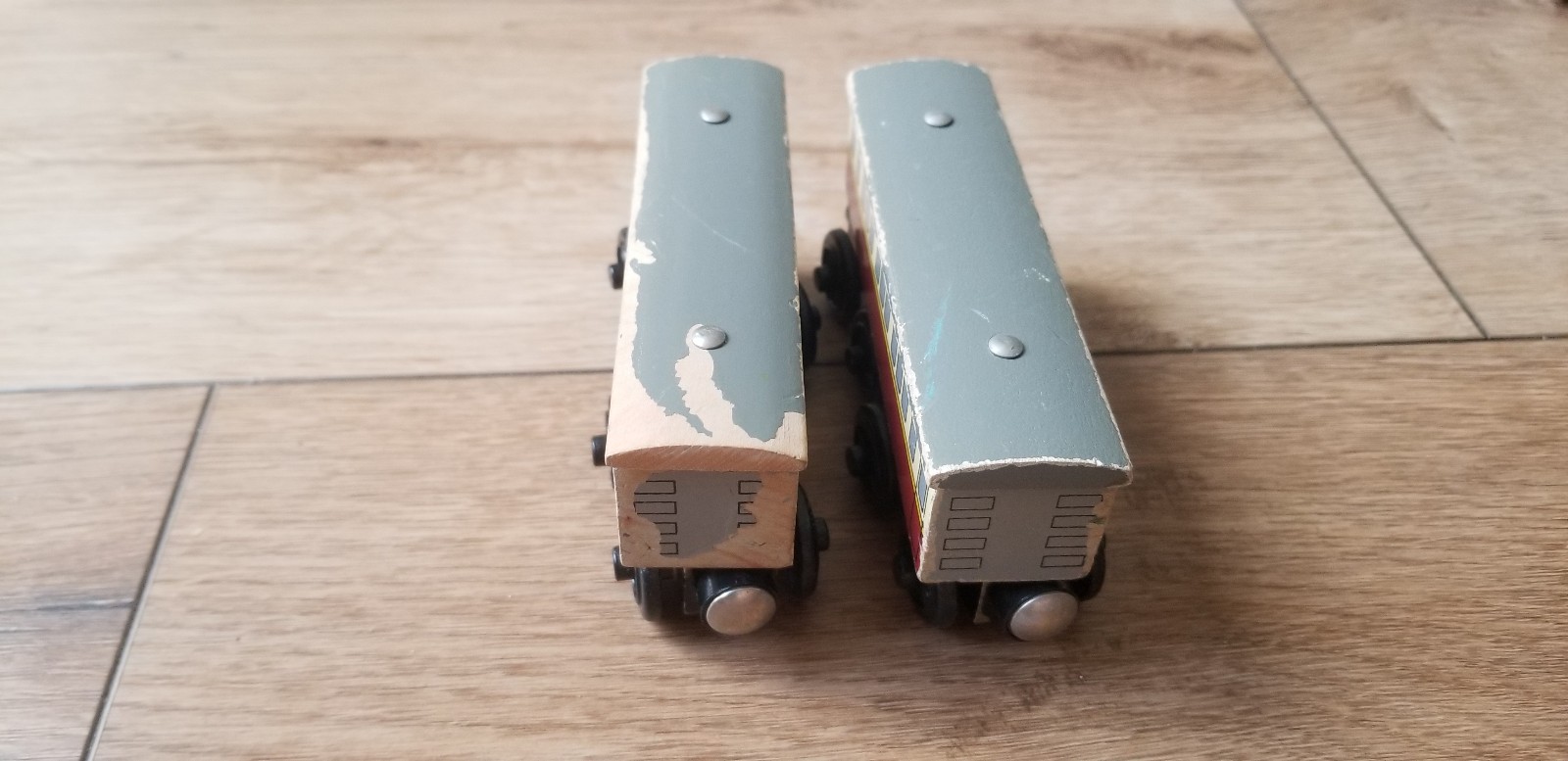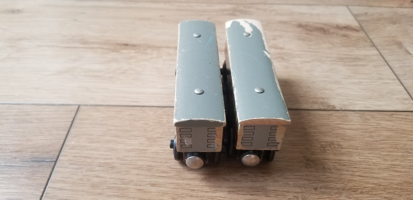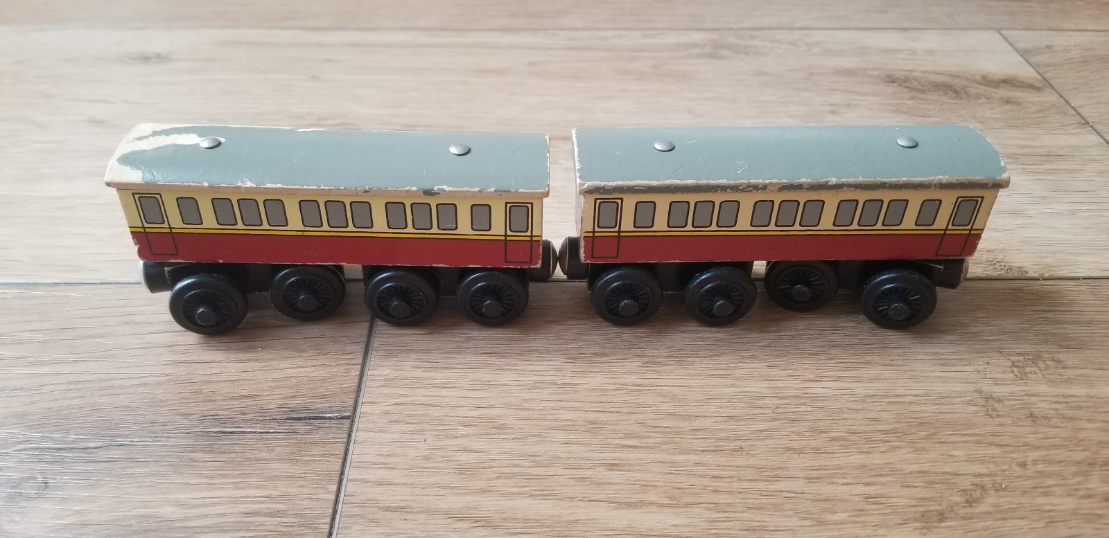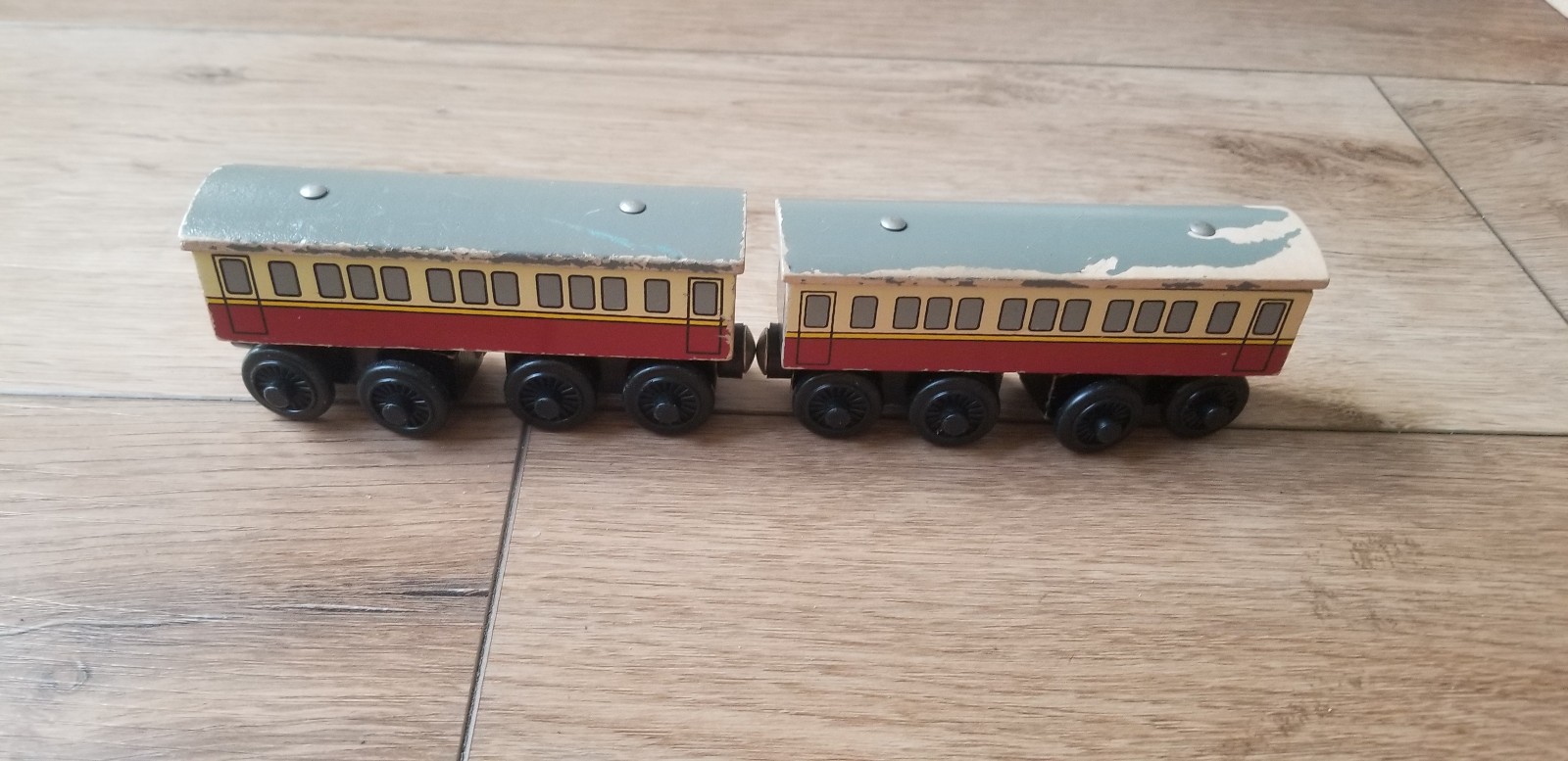 Wooden railway Thomas the train Express coaches or "Gordon's coaches" as my boys called them, in good used condition with heavy signs of play and wear. Perfect for someone not picky. Please see all pictures. Feel free to zoom in to pictures. Pet and smoke free home.